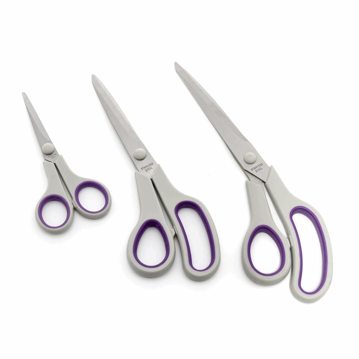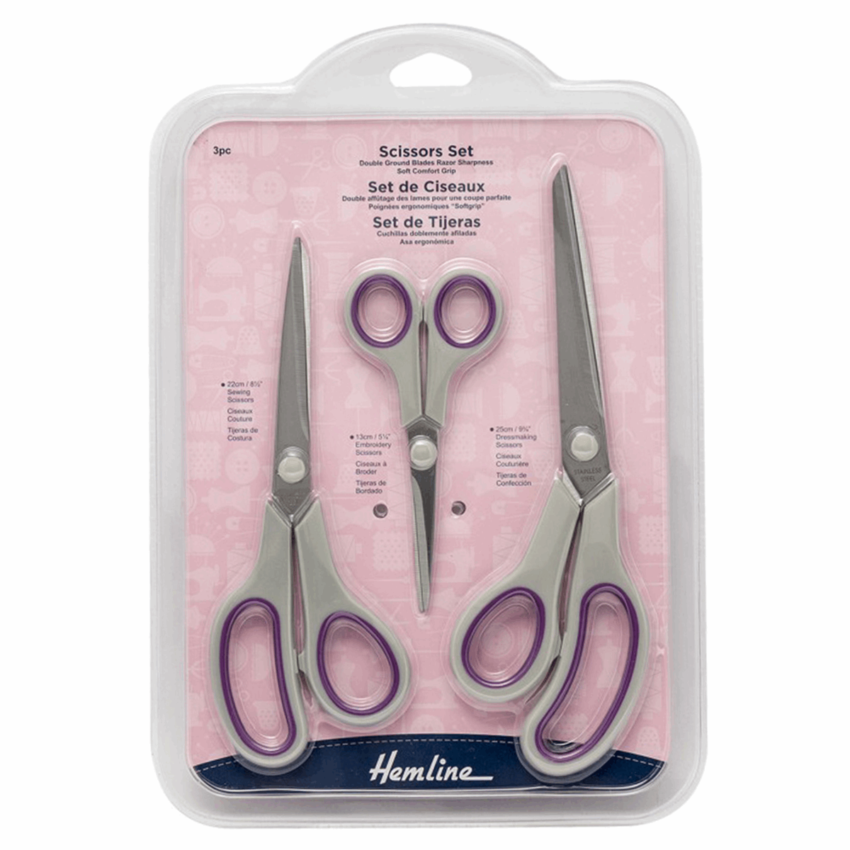 3 piece scissors set: 13cm/5.25in embroidery scissor; 22cm/8.25in sewing scissors; 25cm/9.75in dressmaking scissors. High carbon stainless steel blades. Razor sharp knife edge blades. Full size comfort soft-grip handles.