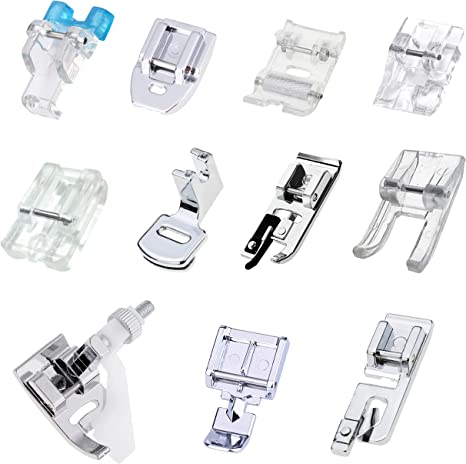 This wonderful set of 11 presser feet for your sewing machine gives you the ability to expand your sewing skills to include working with leather, zippers, buttons, beads, quiltmaking, curtains etc.