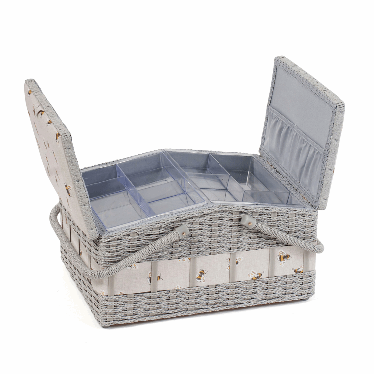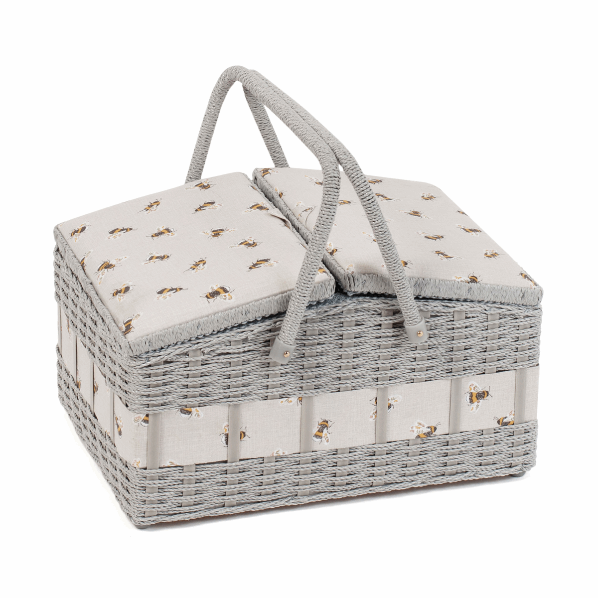 Large basket style wicker sewing box from 100% cotton fabric. Wicker-style handle and detail in body of box. Hard plastic internal tray with compartments for sewing notions. Internal pocket and pincushion inside of lid.