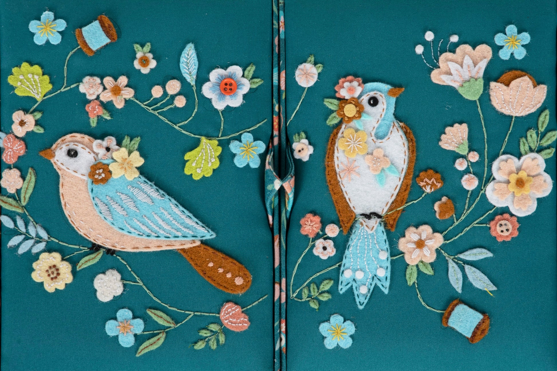 Large, rectangular, twin-lidded sewing box covered in cotton fabric with hand stitched felt embellishments and embroidery. PVC double handles. Hard plastic internal tray with compartments for sewing accessories. Internal pocket and pincushion inside lid. Spot clean only. Item size: (d/w/h) 21 x 30.5 x 19.5cm.