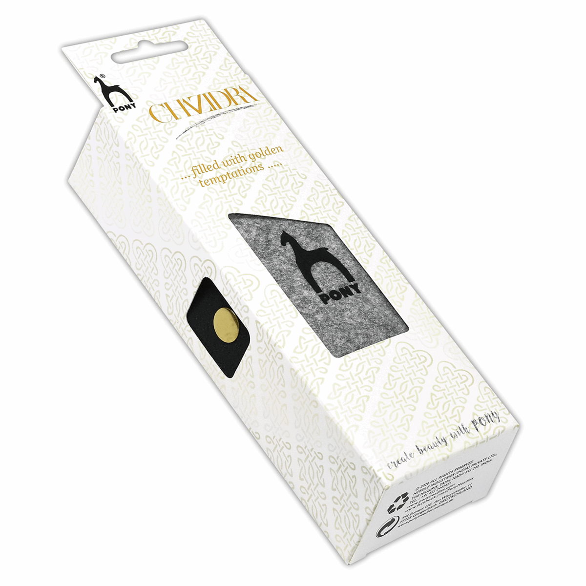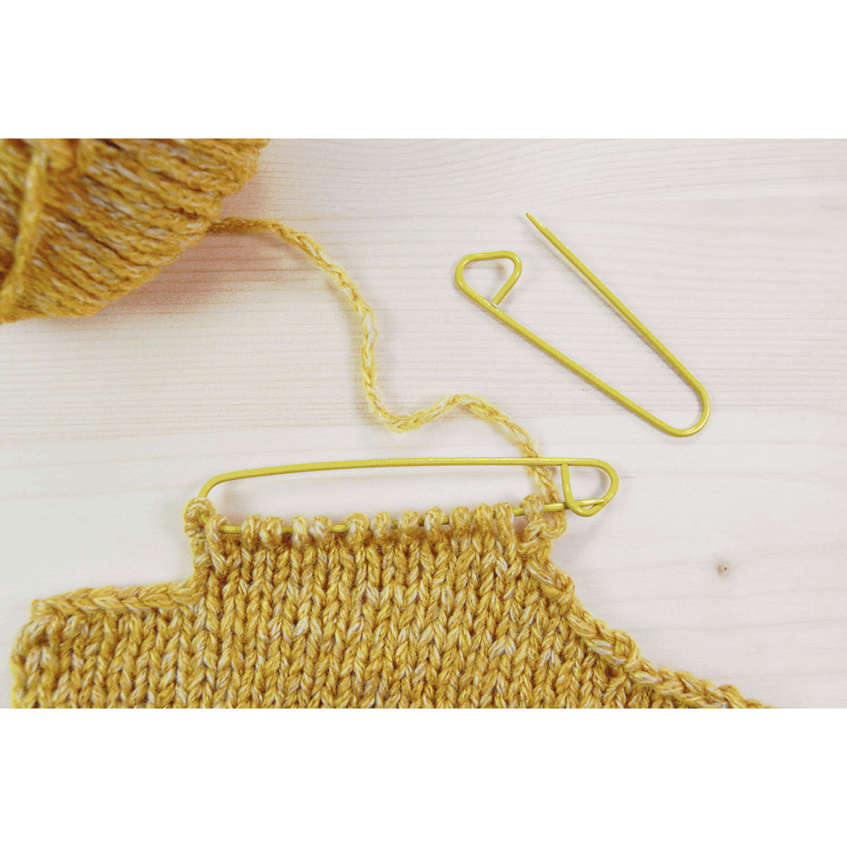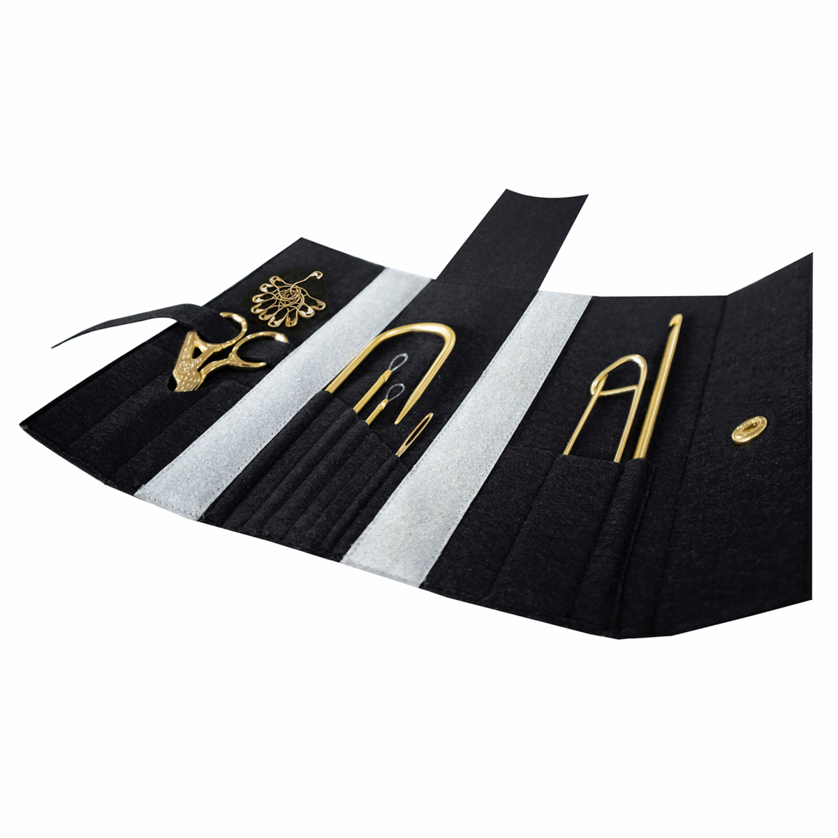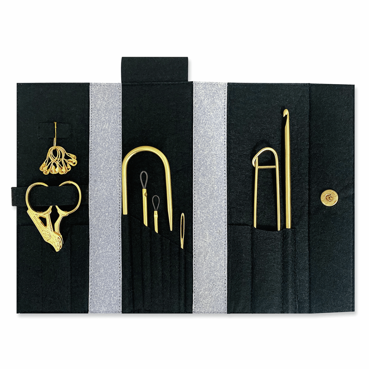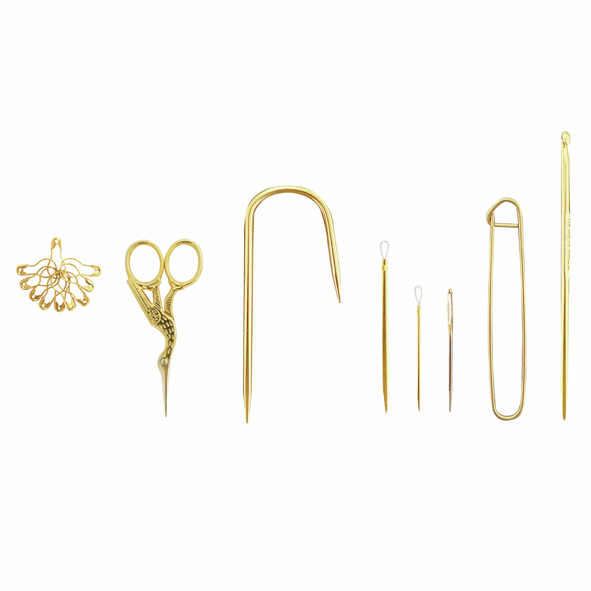 The ultimate luxury with no less than 7 golden knitting tools and 10 golden stitch markers just waiting to be discovered. The Pony pick-up needle is the easy way to catch dropped stitches as well as providing a 4mm crochet hook. The U-shaped cable needle is the smart choice for keeping cables in place on the curve. The wool needles with large flexible eyes are the quick way to sew completed projects together. The 22 carot gold-plated tapestry needle with its smooth rounded point makes embroidering on knits a breeze. The stitch holder secures stitches whenever you choose to take a break and the cute little pear shaped safety pins are your nifty stitch markers. A beautiful pair of sharp pointed stork scissors are ideal for trimming loose ends and achieving perfection.