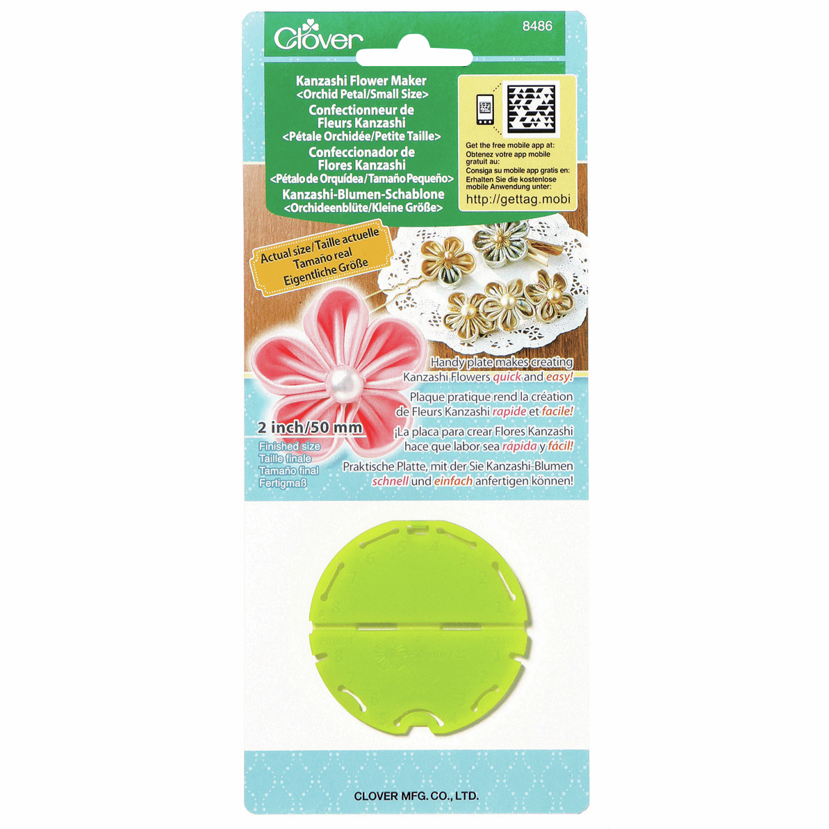 Kanzashi is traditional Japanese art form of folding and stitching fabric petals. This handy plate makes creating these flowers quick and easy. Make one petal using the Kansashi maker and then string more petals together to make a complete flower. Add more petals or adornments to make unique flower creations.
