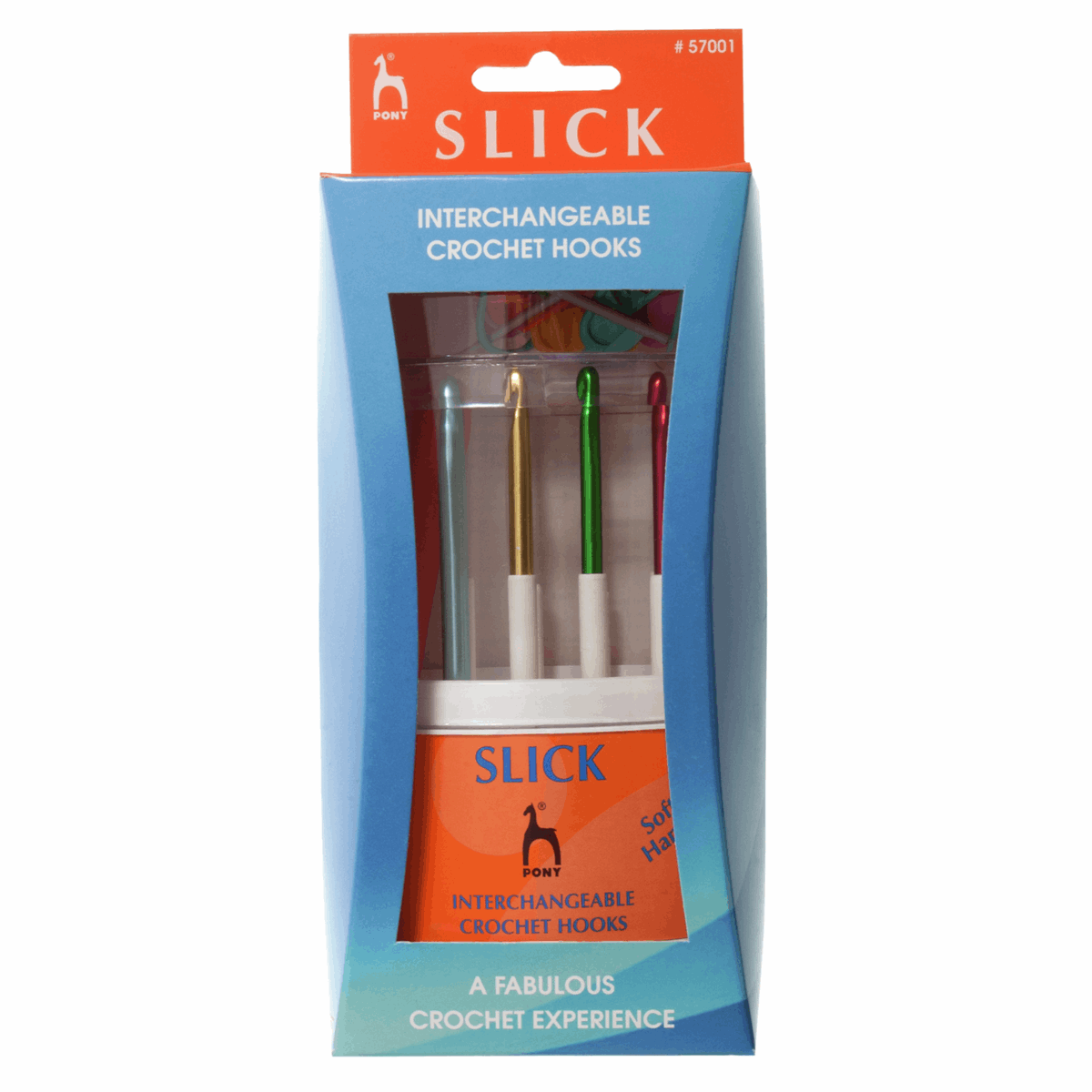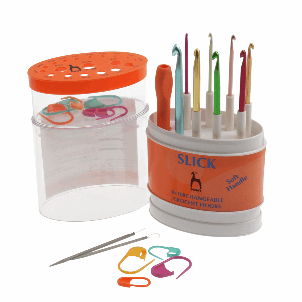 Storage tub containing 1 easy grip handle, 8 crochet hooks sizes 2.00 - 6.00 in highly polished, coloured, anodised aluminium, 2 wool needles, 10 safety stitch markers. The tub lid incorporates a useful knitters gauge. Colour coded sizing.