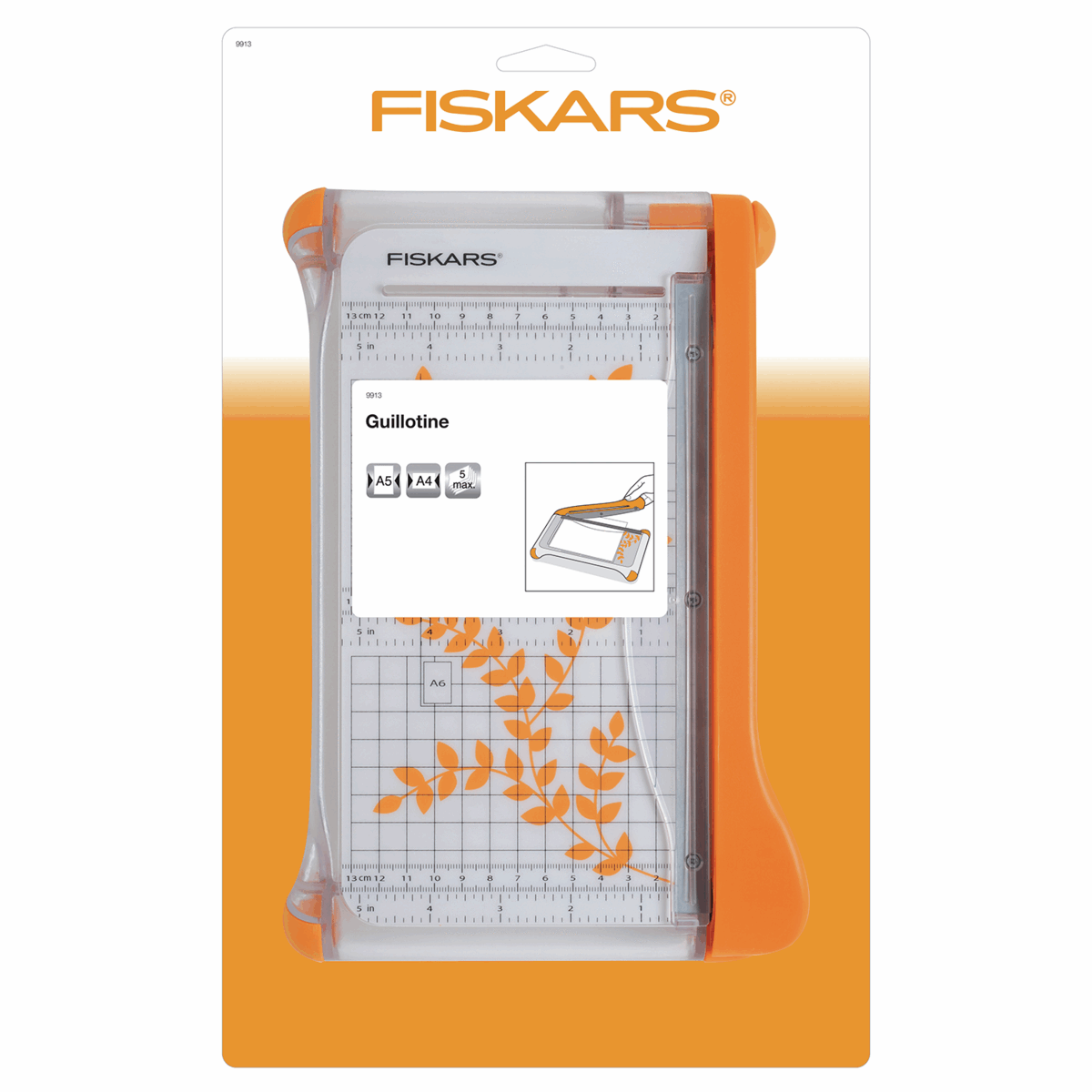 Mini guillotine. Best for cutting cards, photos, flyers, invitations and digital scrapbooking. Cuts up to 5 sheets (80gsm) at once. Anti-wear metric and inch measurements for easy guidance. Landscape format up to A4, portrait format up to A5. Transparent finger guard clamps paper and protects from fingerprints. Rubberised non-slip feet keeps trimmer stable.