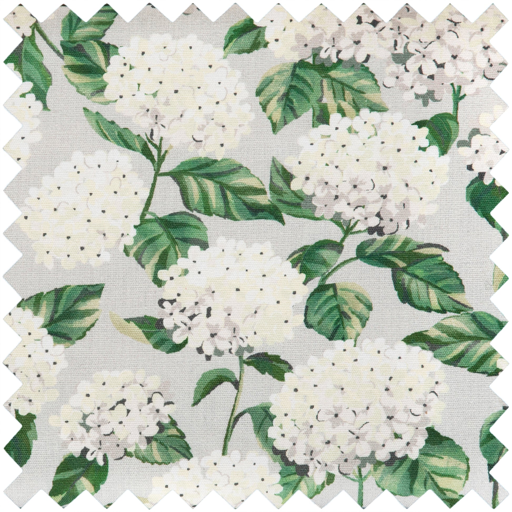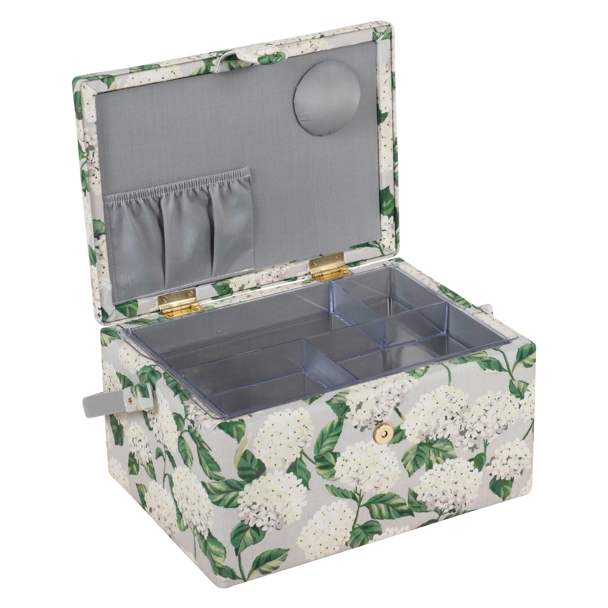 Medium-sized sewing box covered in cotton fabric. Plastic handle. Hard plastic internal tray with compartments for sewing accessories. Internal pocket and pincushion inside lid. Spot clean only. Item size: (d/w/h) 18.5 x 25.5 x 14.5cm.