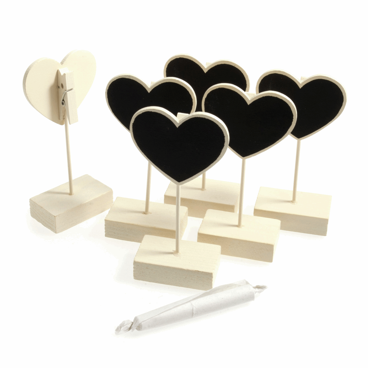 You could also use these chic decorations to embellish your table arrangements by adding place cards or photos into the peg holders, with names or messages written onto the chalk heart.