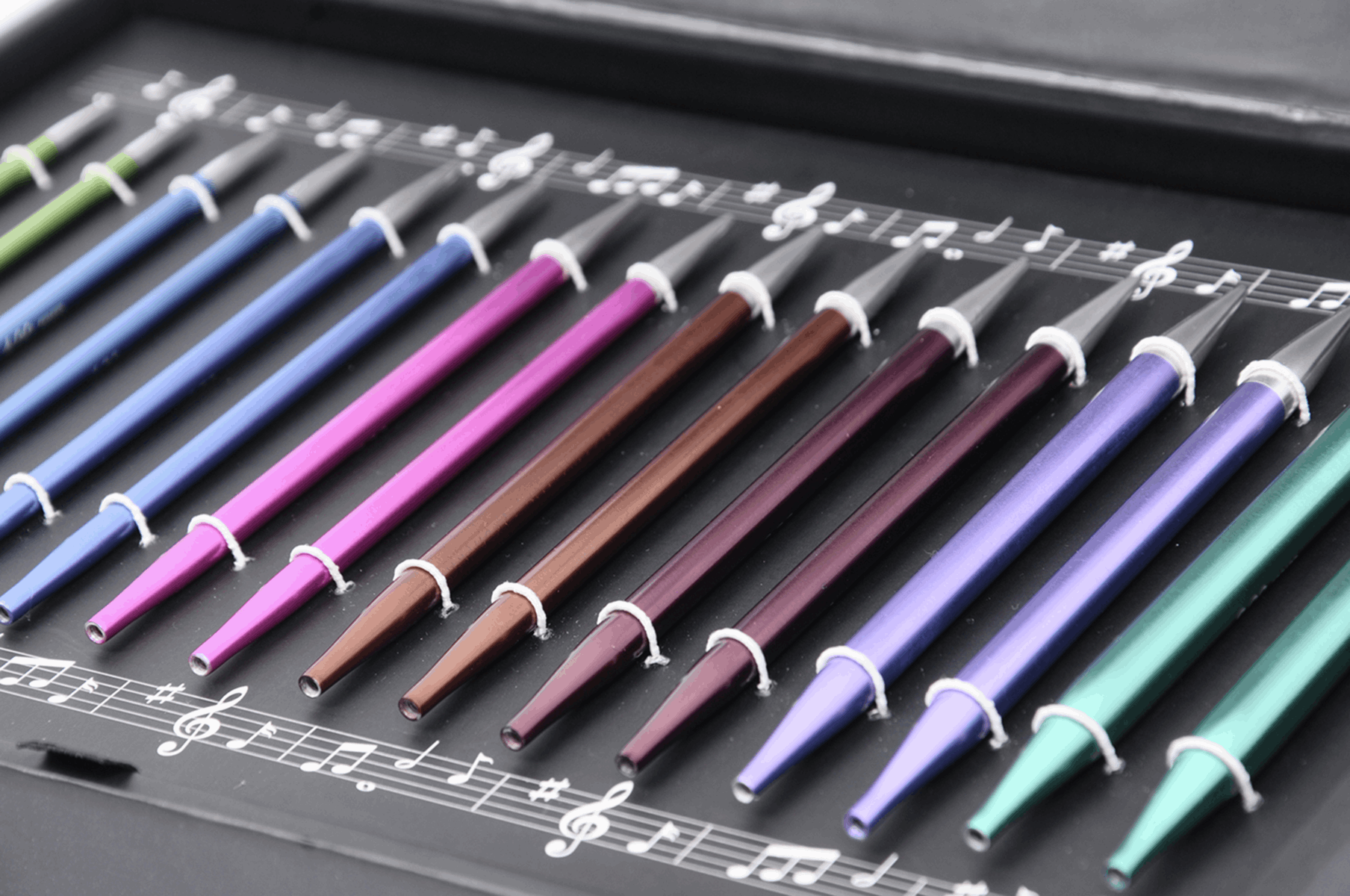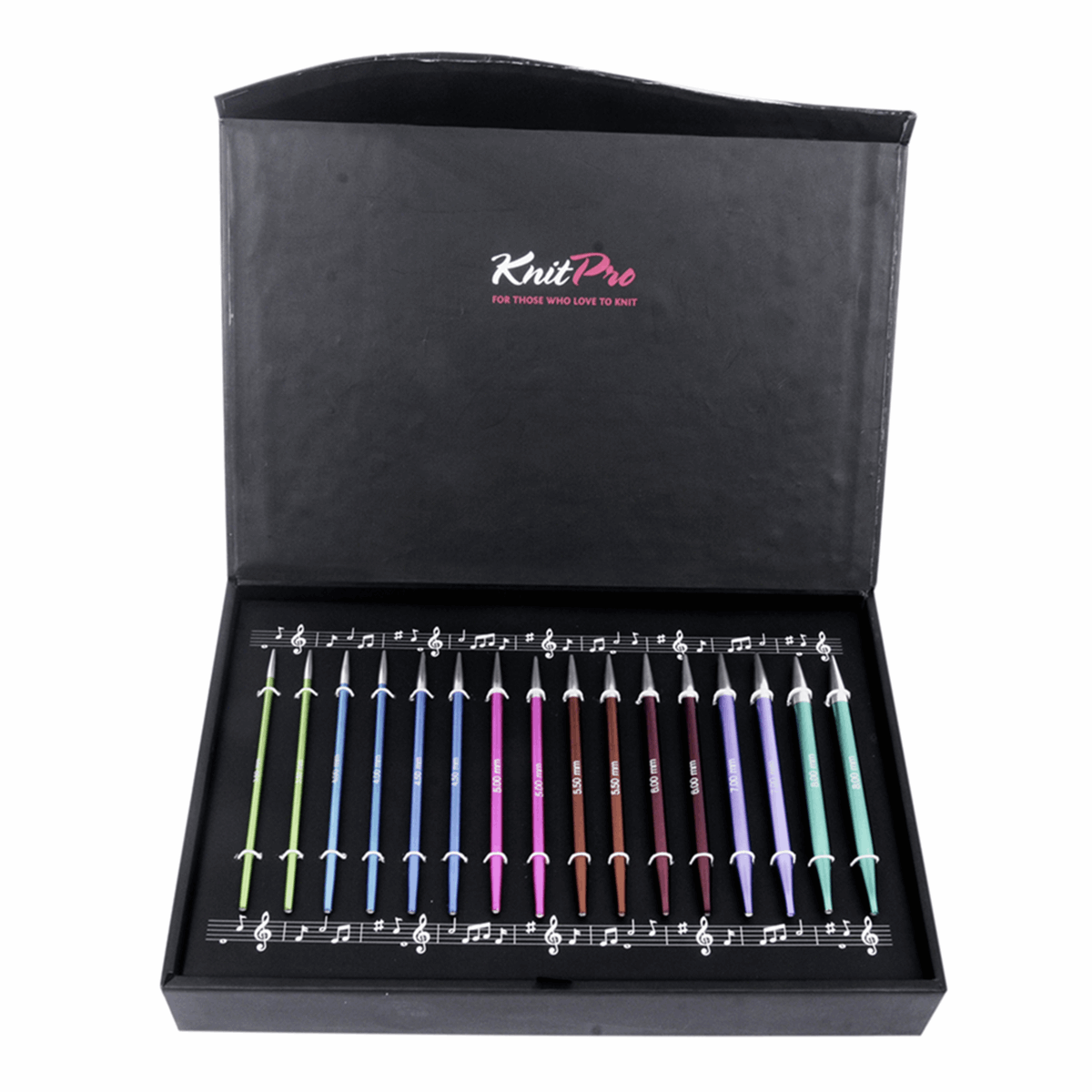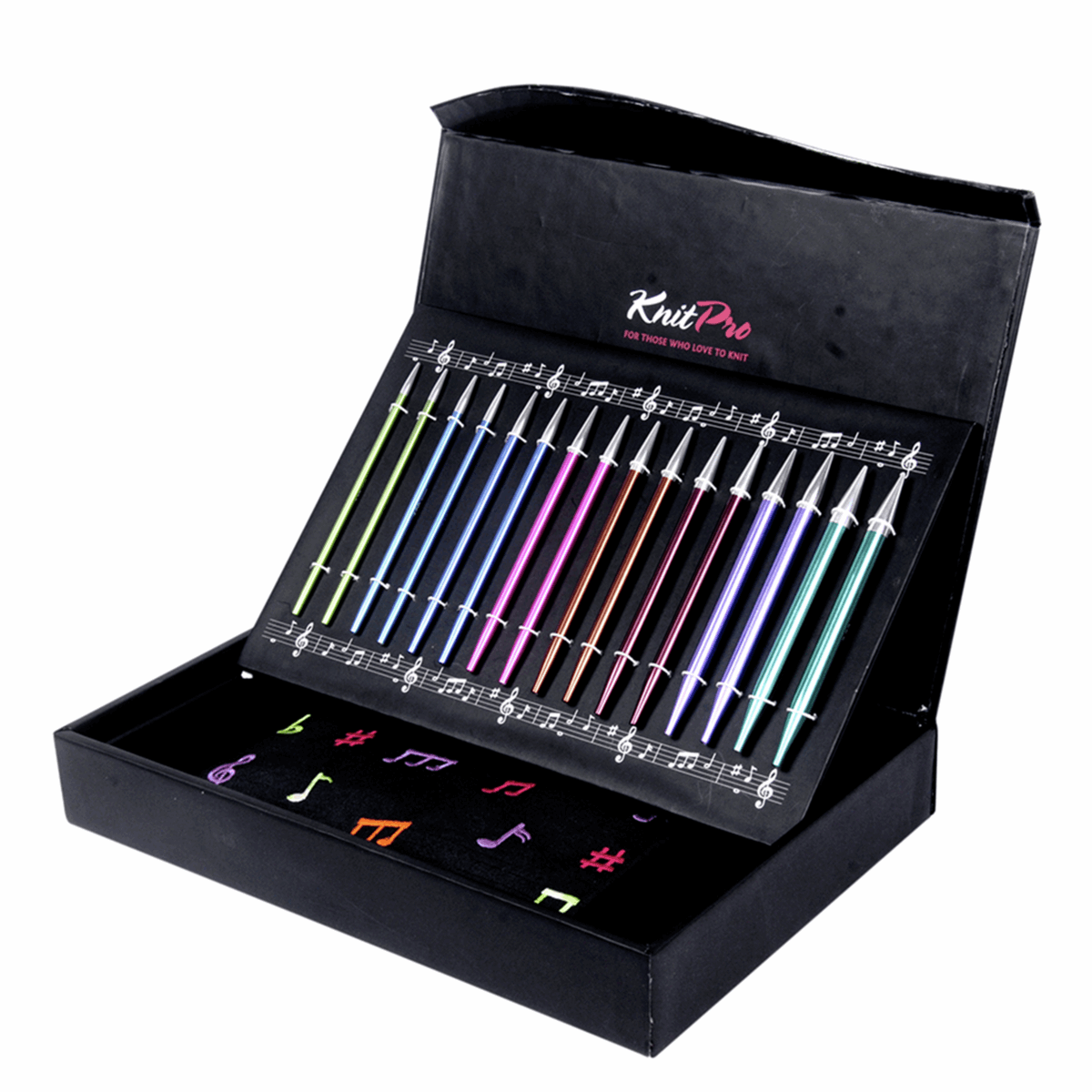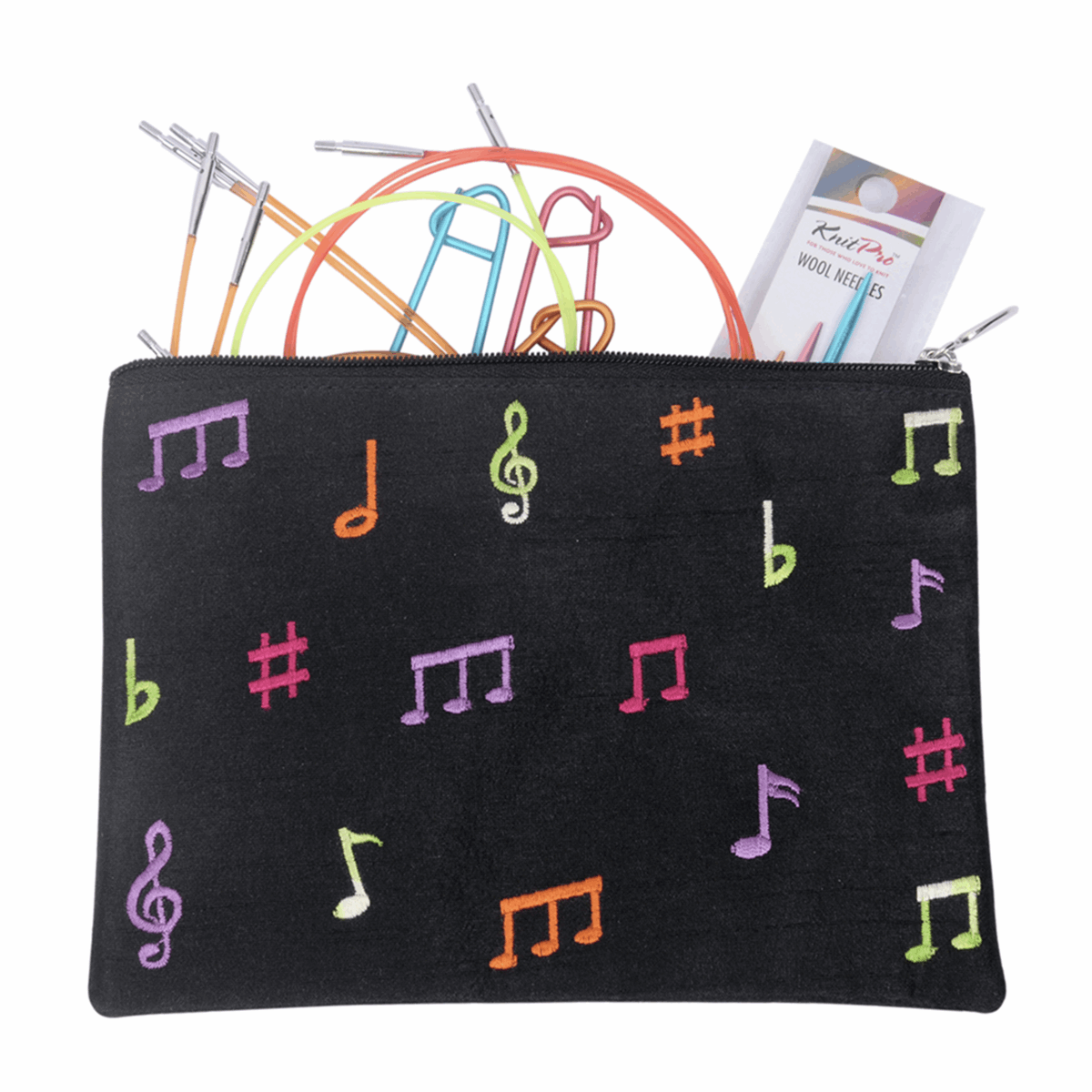 Contents: 8 pairs of Zing needles with lazer marked sizes - 3.5, 4.0, 4.5, 5.0, 5.5, 6.0, 7.0 & 8.0mm; Cables - 60cm (green), 80cm x 2 (orange), & 100cm (red); a set of cable connectors, wool needles and stitch holders in a coordinated monogrammed fabric pouch.