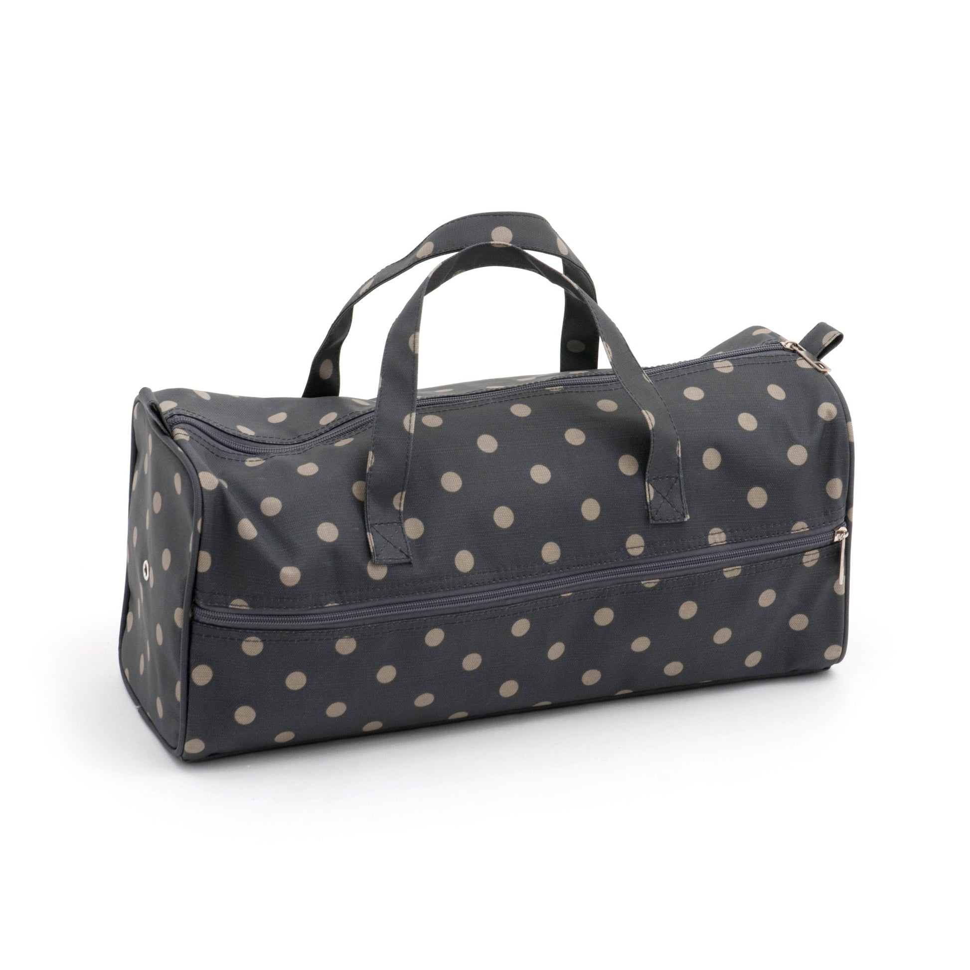 Knitting bag made from matt PVC coated cotton fabric. Zip up pocket on the front and with double handles. Eyelet for feeding through yarn. Perfect for storing knitting projects, yarn and pins up to 40cm long. Spot clean only. Item size, (d/w/h) 16 x 43 x 19cm.