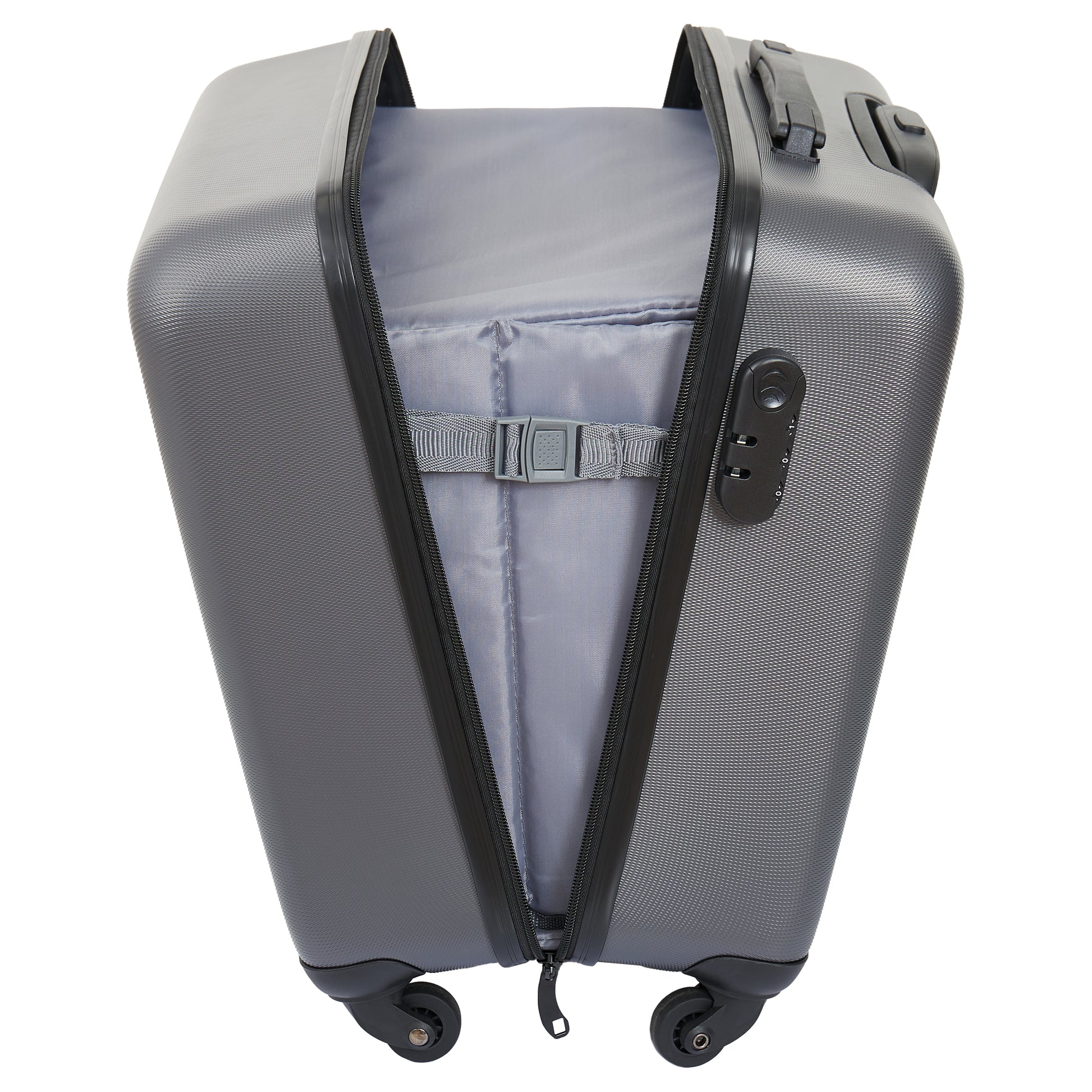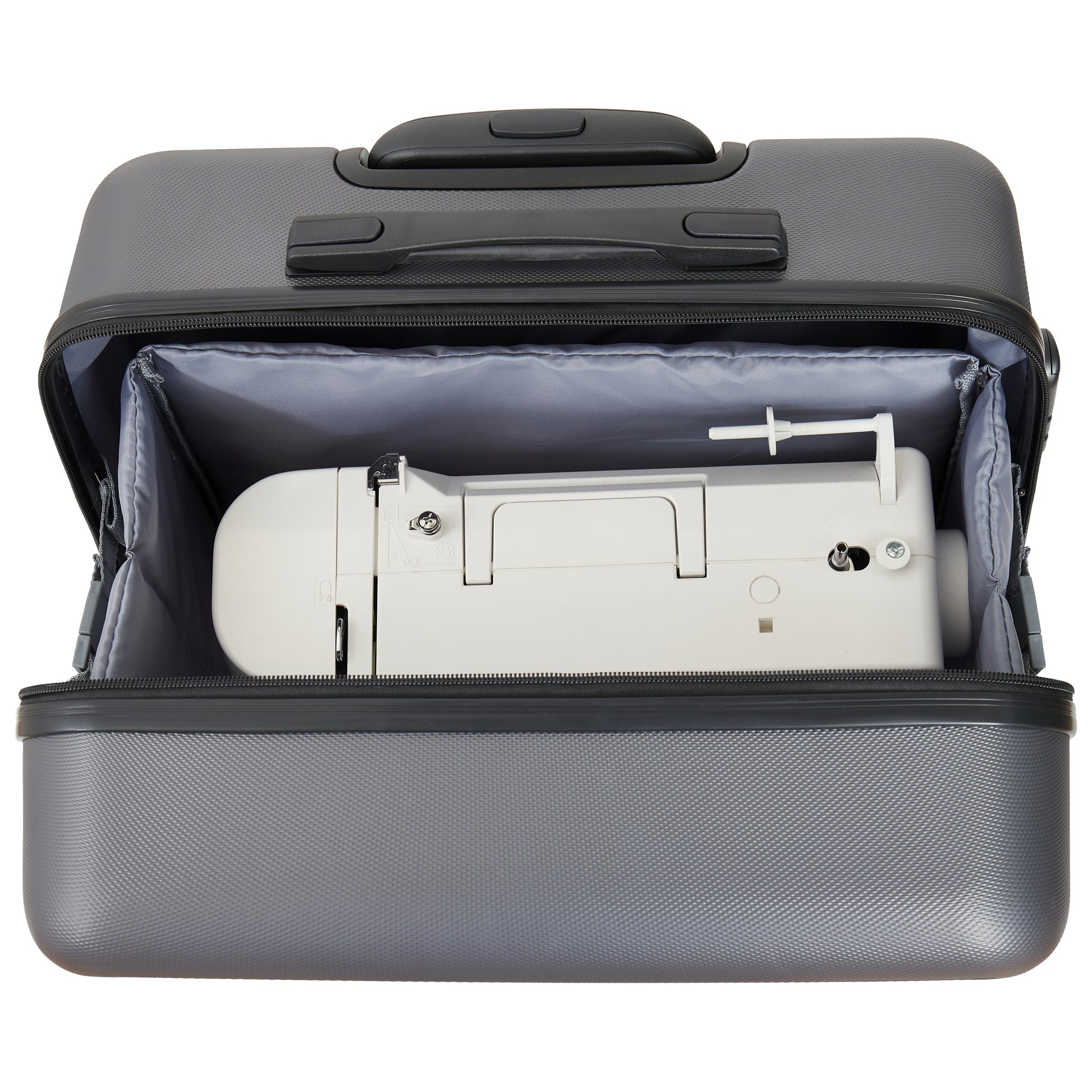 Sewing Machine Trolley Bag in silver colour with a telescoping handle, a lock, inner padding, wooden base and wheels. This sewing machine trolley bag fits all standard sewing machines and it's perfect for anyone who loves to travel. Ideal for storage and easy to carry on everywhere you go. Telescoping handle extends to 89cm. The outer material of this bag is made of high-quality ABS plastic, a water-resistant covering making the bag ideal for protecting your machine and accessories from accidental water damage, both around the home and in classes or during transit. Wide opening design makes it easy to get your sewing machine in and out, also inner padding protects the machine from being damage.