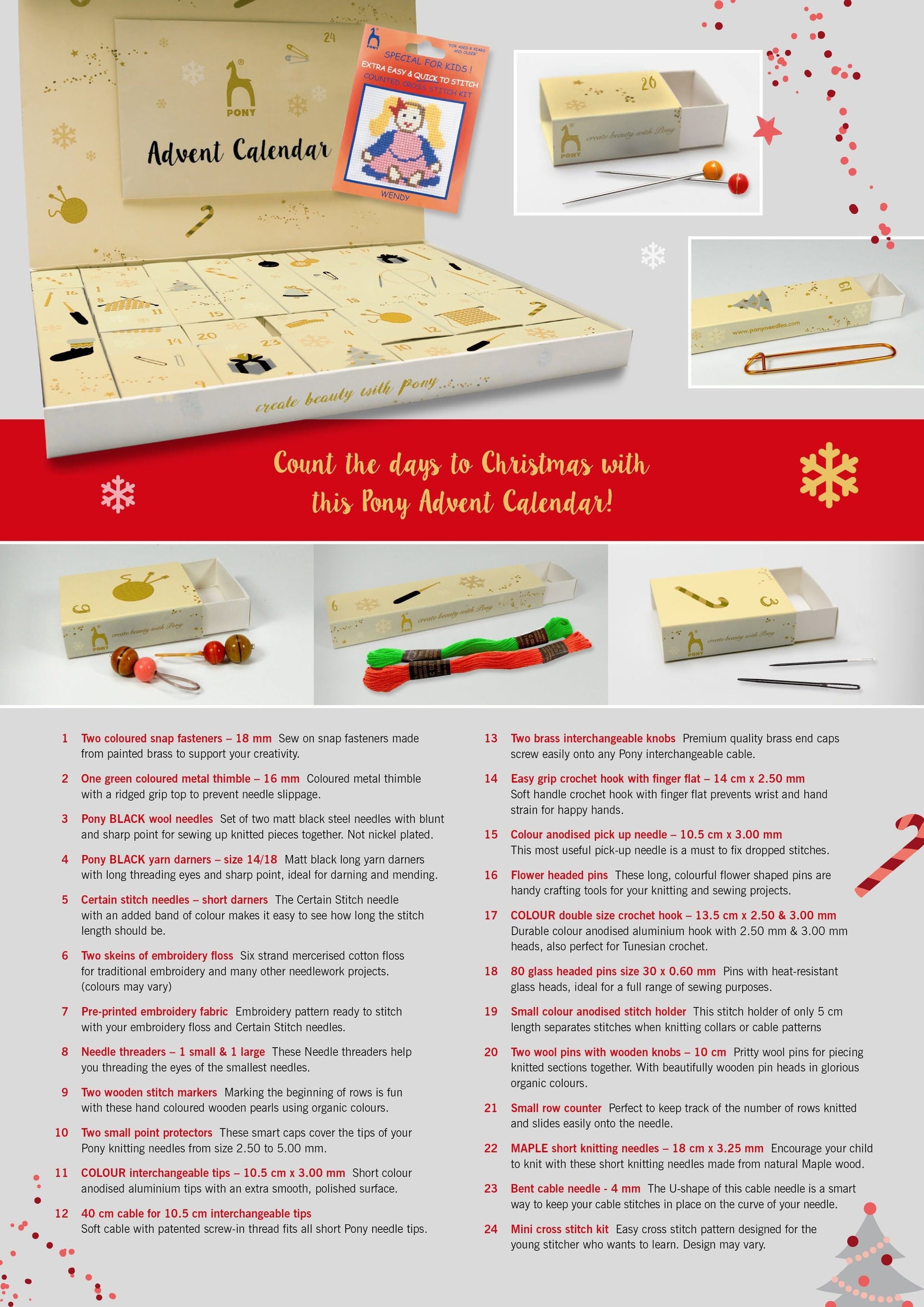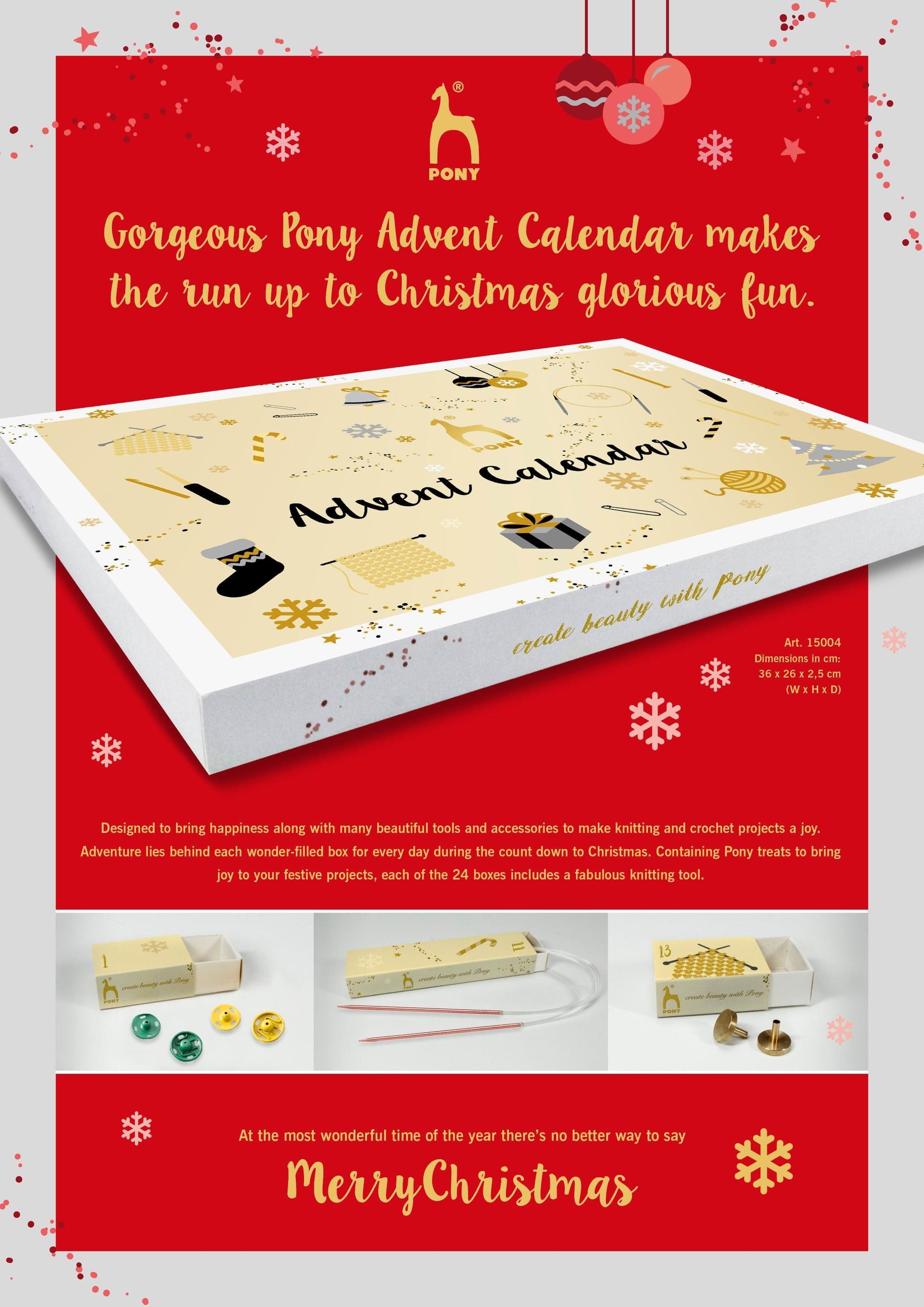 It contains 24 doors that are filled with products from Pony for your knitting and crocheting projects during the holidays.