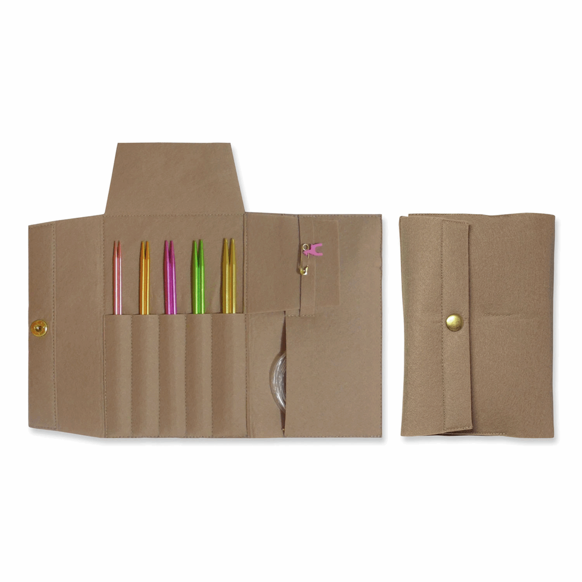 Needle case contains beautiful colour aluminium anodized knitting pins which have an extra smooth, polished surface and assure you of a supremely comfortable and enjoyable knitting experience. Contents: set of 5 pairs 14cm pin shanks in sizes 3.00, 3.50, 4.00, 4.50 and 5.00mm; 3 cables for three lengths 60, 80 and 100cm; 2 knobs for cable ends; 1 connector to combine cables.