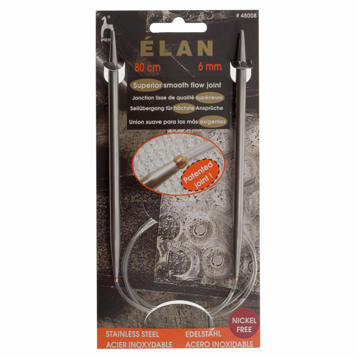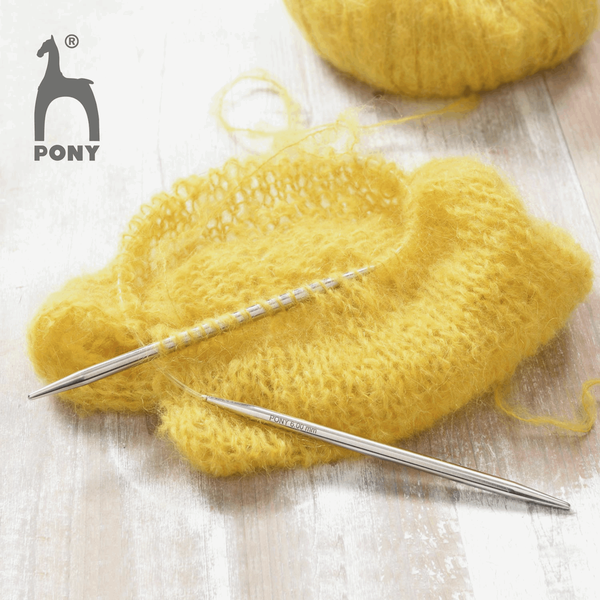 Nickel-free stainless steel knitting pins designed specifically for those with nickel allergies. The PONY ‘Elan’ circular knitting pins offer a smooth and trouble-free knitting experience, thanks to their patented snag-free 'Glydon Joint' and gently tapered needles that ensure a seamless transition onto the cable.