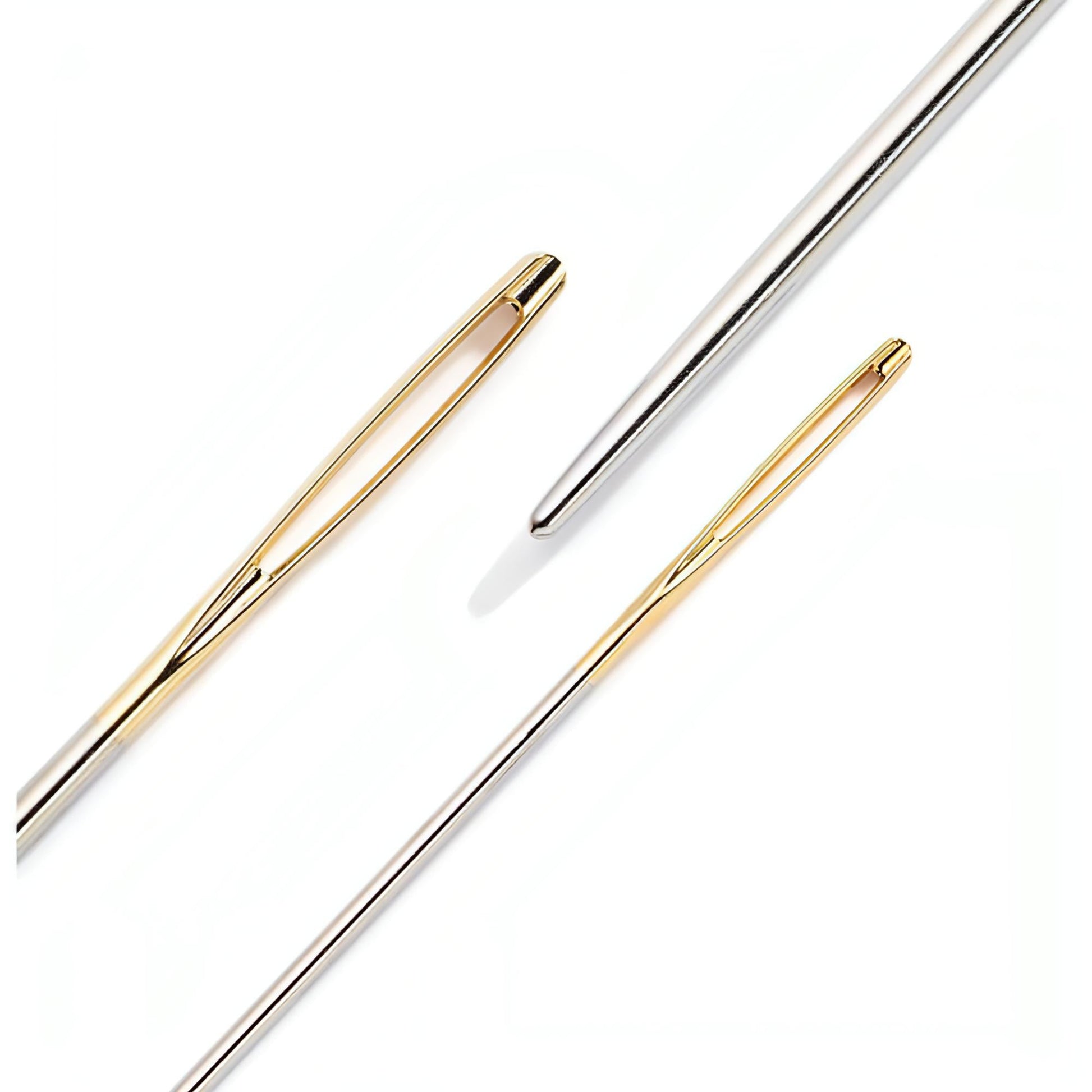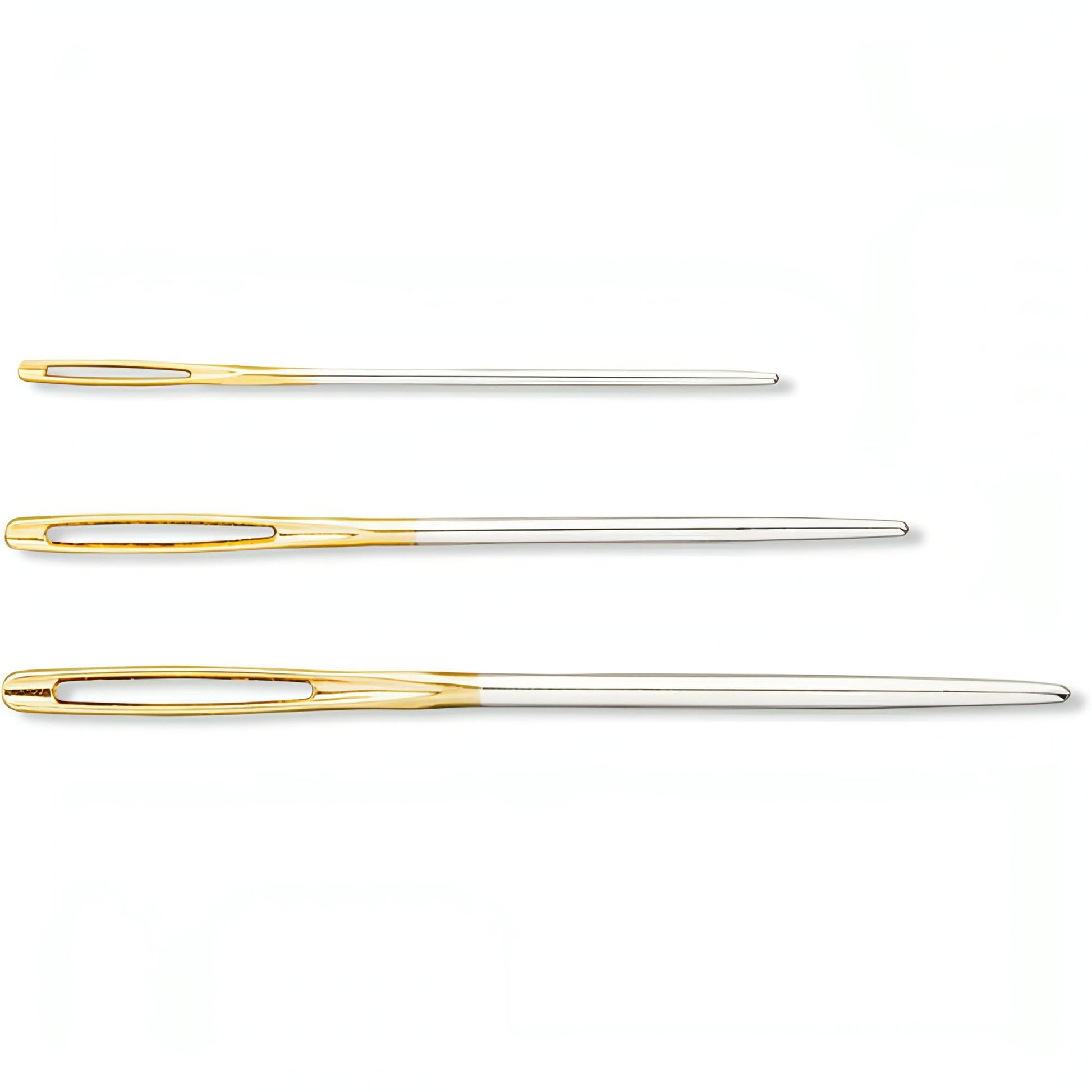 Pack includes - 3 x Wool & Tapestry Needles, silver with gold eyelet. Sizes 1, 3 & 5.