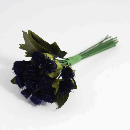 The flower heads are attached to a wired stem so they can be wrapped around objects to keep them in the correct position. Each spray measures approximately 11cm long. Each has 12 thistle heads and 4 leaves with paper wrapped wire stems. Thistle heads measure approximately 1.6cm tall, including green.