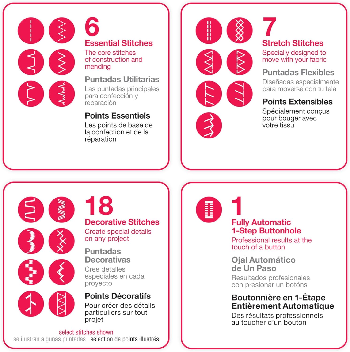 Six Basic Stitches, four Stretch Stitches, 22 Decorative Stitches, and one Buttonhole—perfect for crafts, home décor, clothing construction and much more!