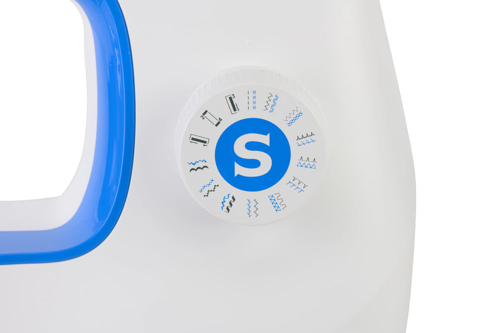 Satin white and azure blue finish with LED lighting - 23 stitch patterns - 4 step buttonhole - auto needle threader - overlocking and stretch stitches