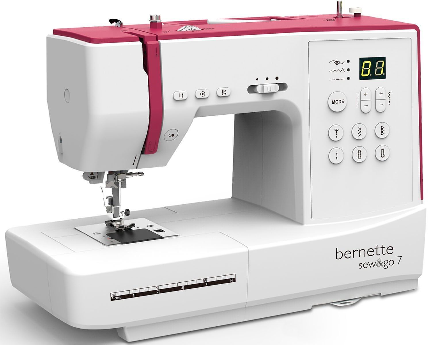The BERNINA bernette sew&go 7 is a computer model for beginners to ambitious sewers. The stitch package includes 80 stitches with a generous maximum stitch width of 7 mm and 15 needle positions. The practical start/stop function lets you control the stitching process without using the foot pedal. The needle position up/down function allows you to specify the needle position at end of a row of stitching – a big advantage e.g. when stitching corners. In addition, the sewing speed can be adjusted according to the fabric or the difficulty of the detail being sewn. The BERNINA bernette sew&go 7 comes with seven presser feet as standard.